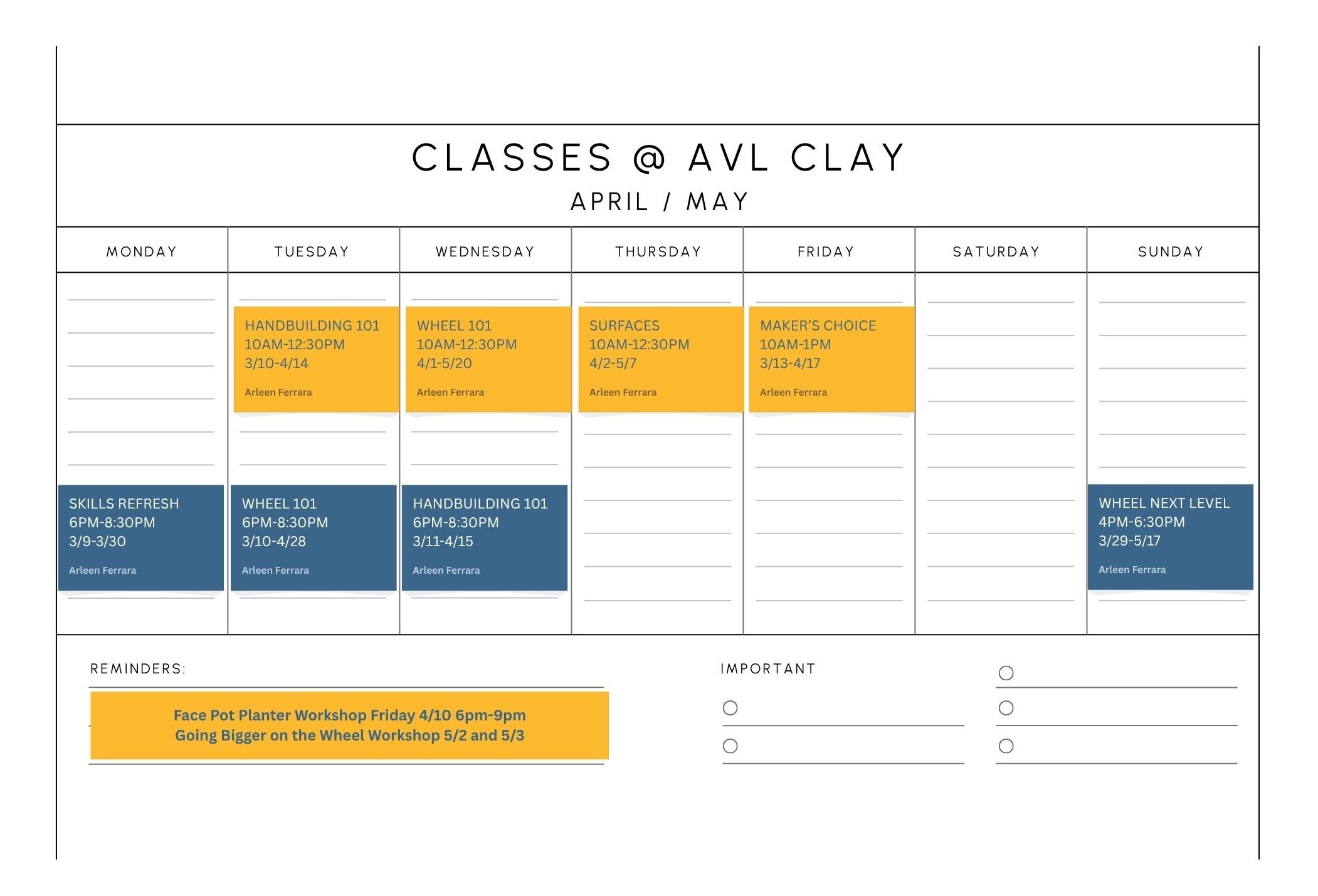 Please remember…NO BIG BALLS OR WADS OF CLAY IN THE RECLAIM BUCKETS, THIS IS VIRTUALLY IMPOSSIBLE FOR THE STUDIO TECHS TO RECLAIM